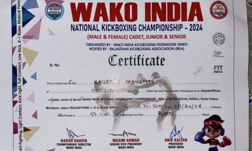 Kaustuv Mohanty (2302611)secured the Gold Medal in the Senior Category (-56kg) at the National Kickboxing Championship 2024, held in Rajasthan. This achievement is a testament to his dedication, hard work, and passion for the sport.